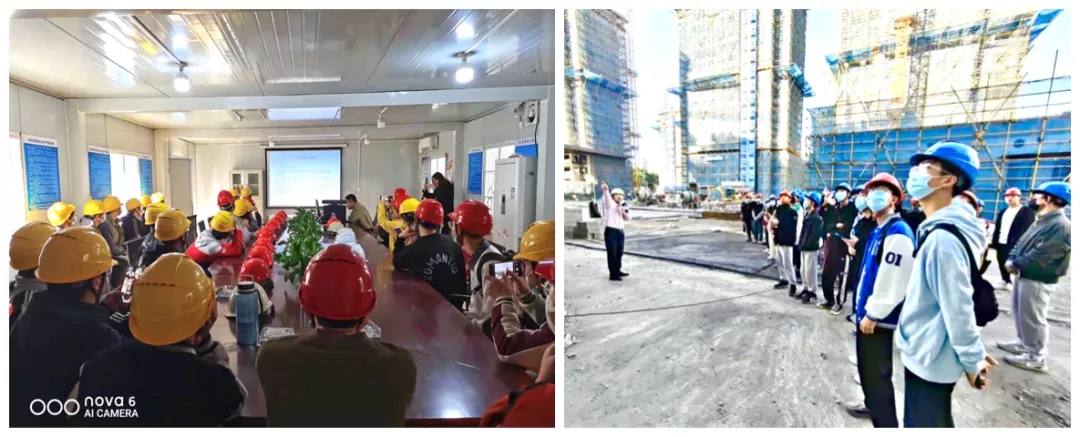 首先,公司綜合部楊日秀、莊天美向同學們宣講了企業(yè)文化;接著由總經理助理兼項目管理二部經理周明安、總工二室主任許楓結合現場從工法技術、工藝流程、標準化作業(yè)、安全防護措施等方面向同學們詳細講解了項目情況。要求每位同學必須佩戴好安全帽,服從指揮,有序進入施工現場參觀。
