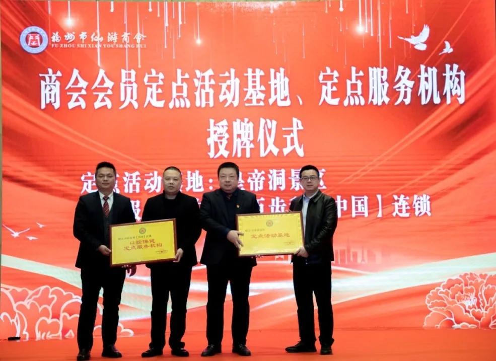 楊鋒監(jiān)事長、羅文棟執(zhí)行會長分別向商會會員定點活動基地皇帝洞景區(qū)、定點服務機構貝臣齒科【中國】連鎖授牌