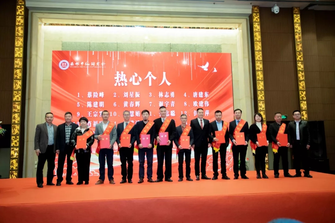 楊鋒監(jiān)事長;羅文棟執(zhí)行會長;唐麗芹常務副會長兼秘書長;常務副會長邱清毓、林承東、張懷玉;鄭瑞椿主任向20名商會熱心個人頒獎